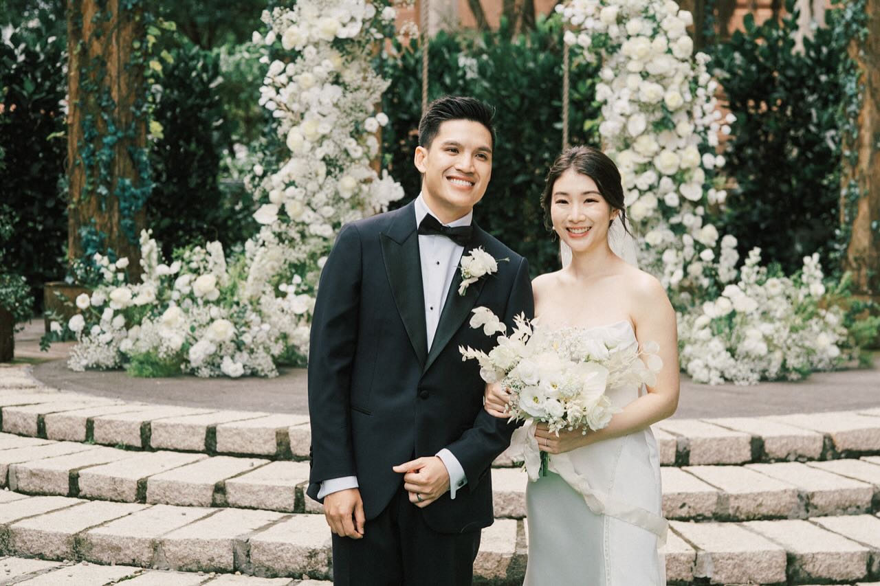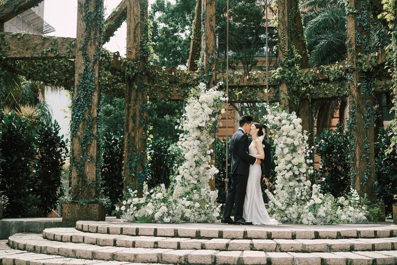 以白為主的證婚花柱與地叢花跳出整體環境,花柱帶一點點綠與戶外場地呼應