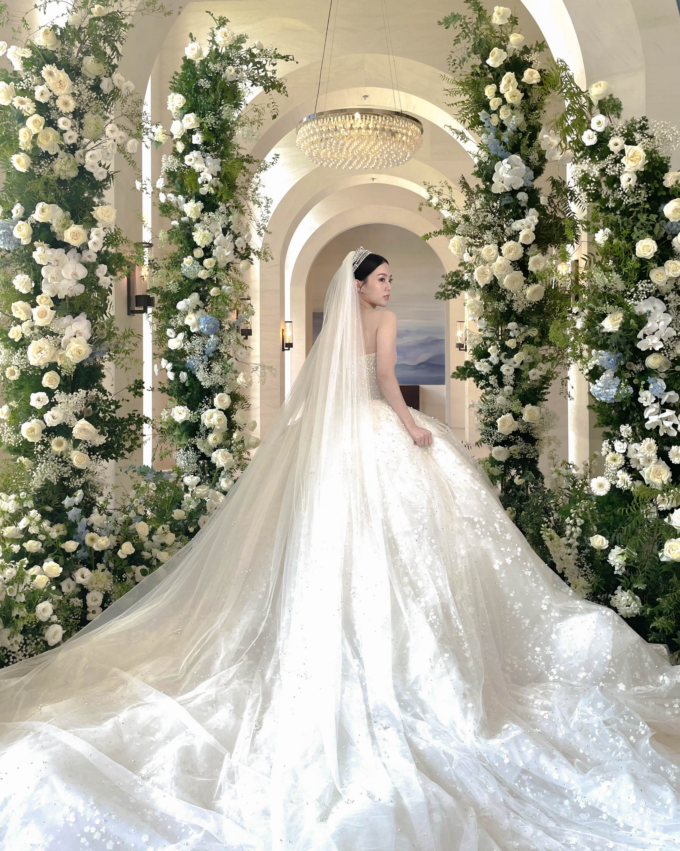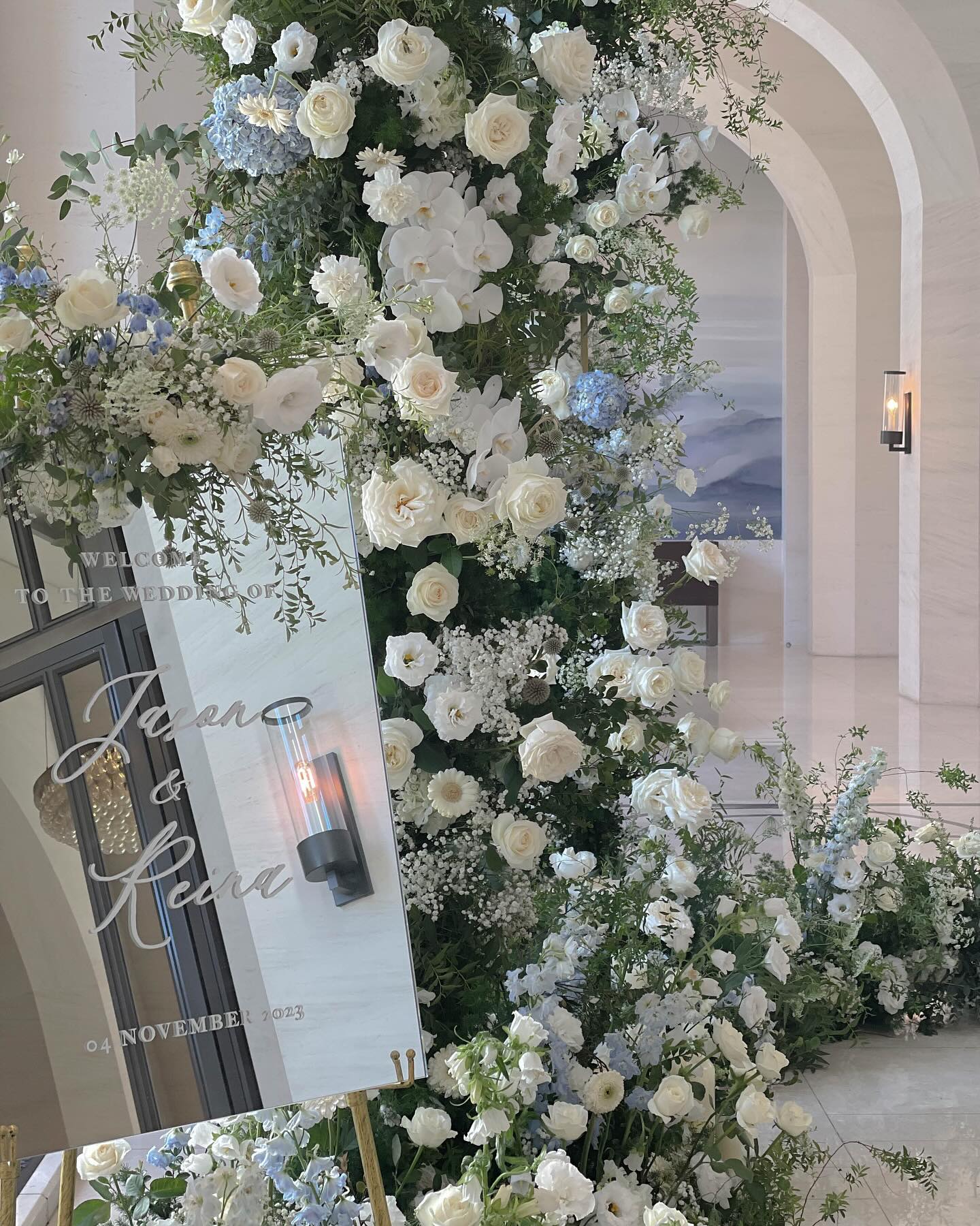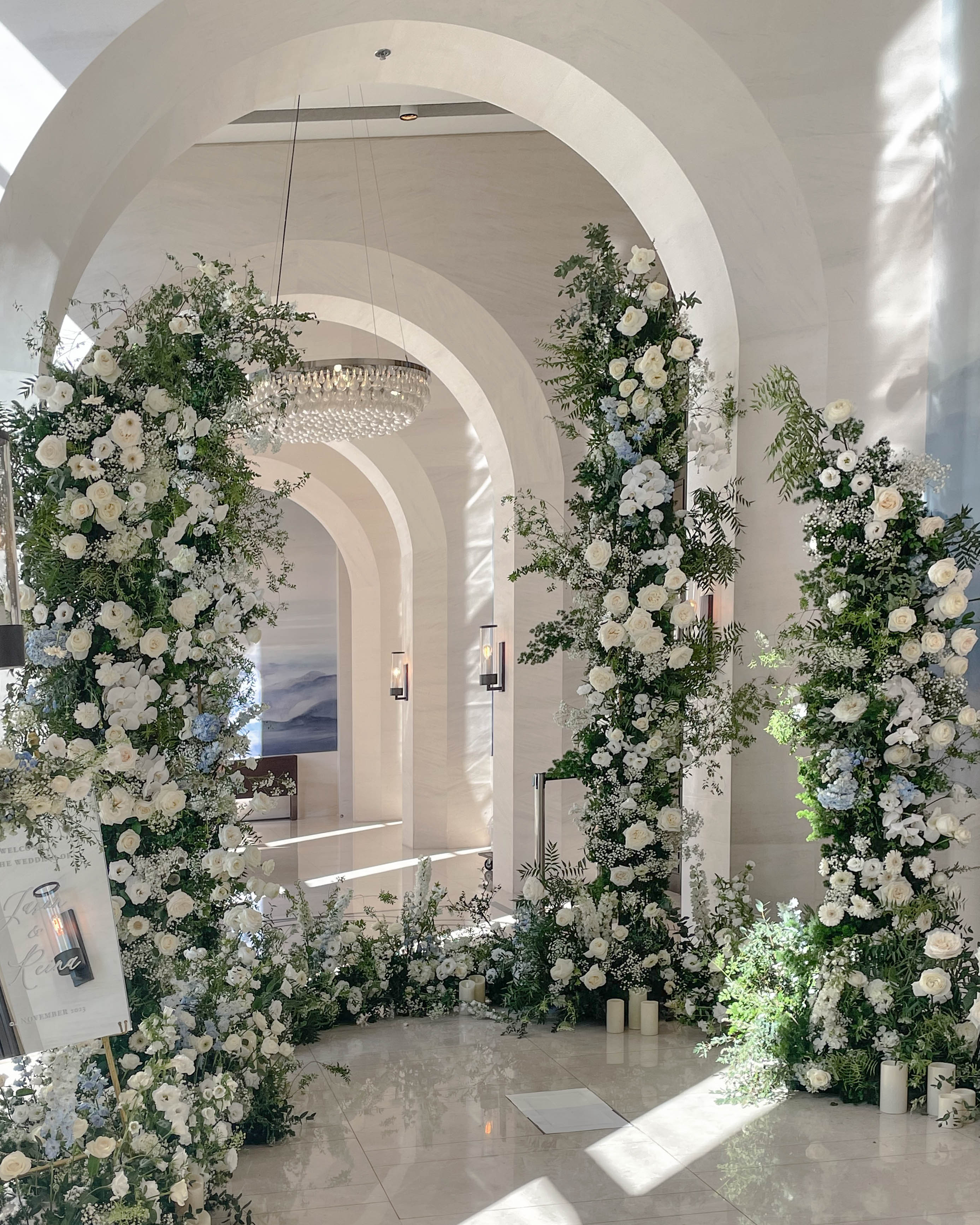 花藝色是經典的白色搭配水藍,融合萬豪場地的挑高拱形,加高的花柱拍照效果很棒🤍🤍