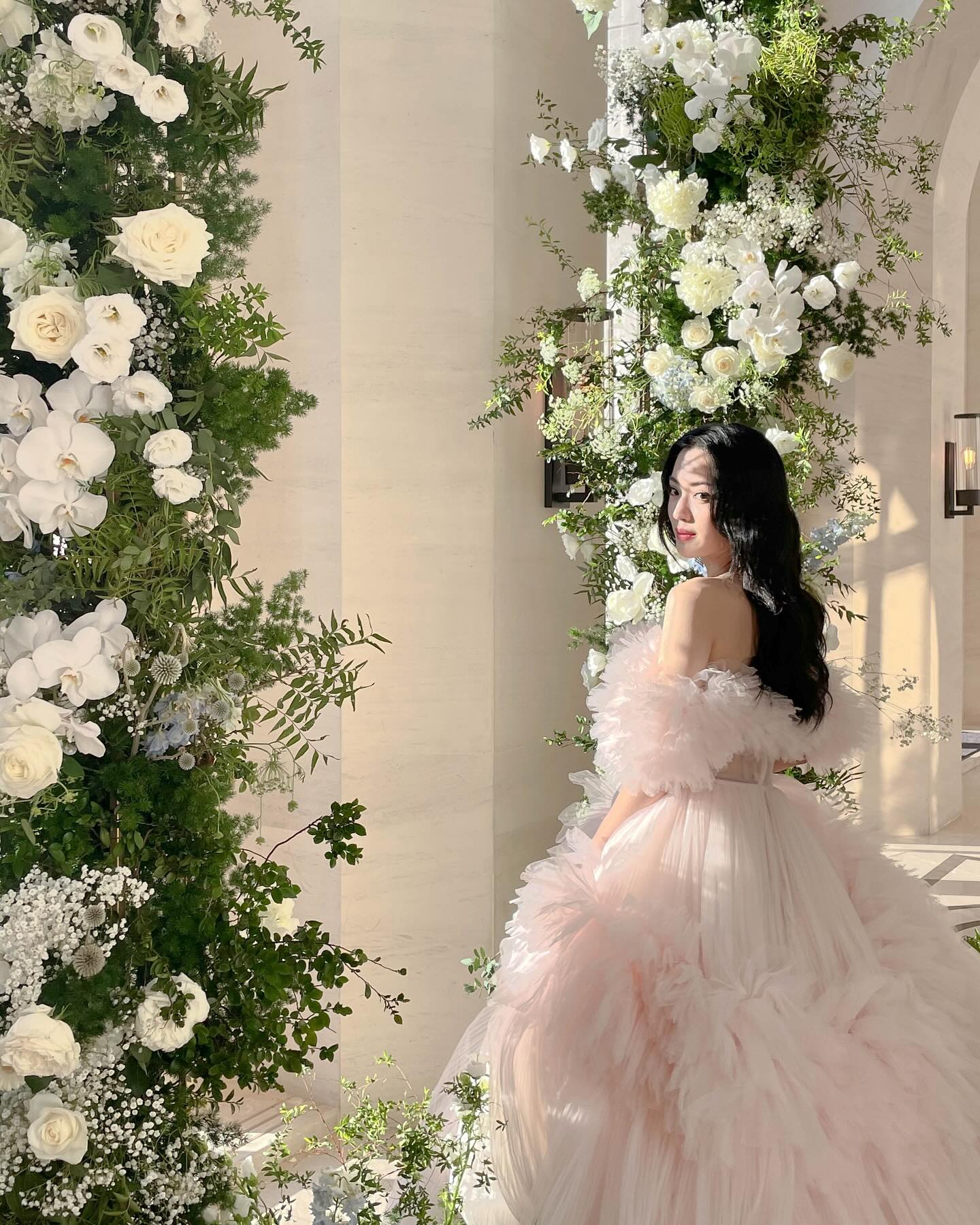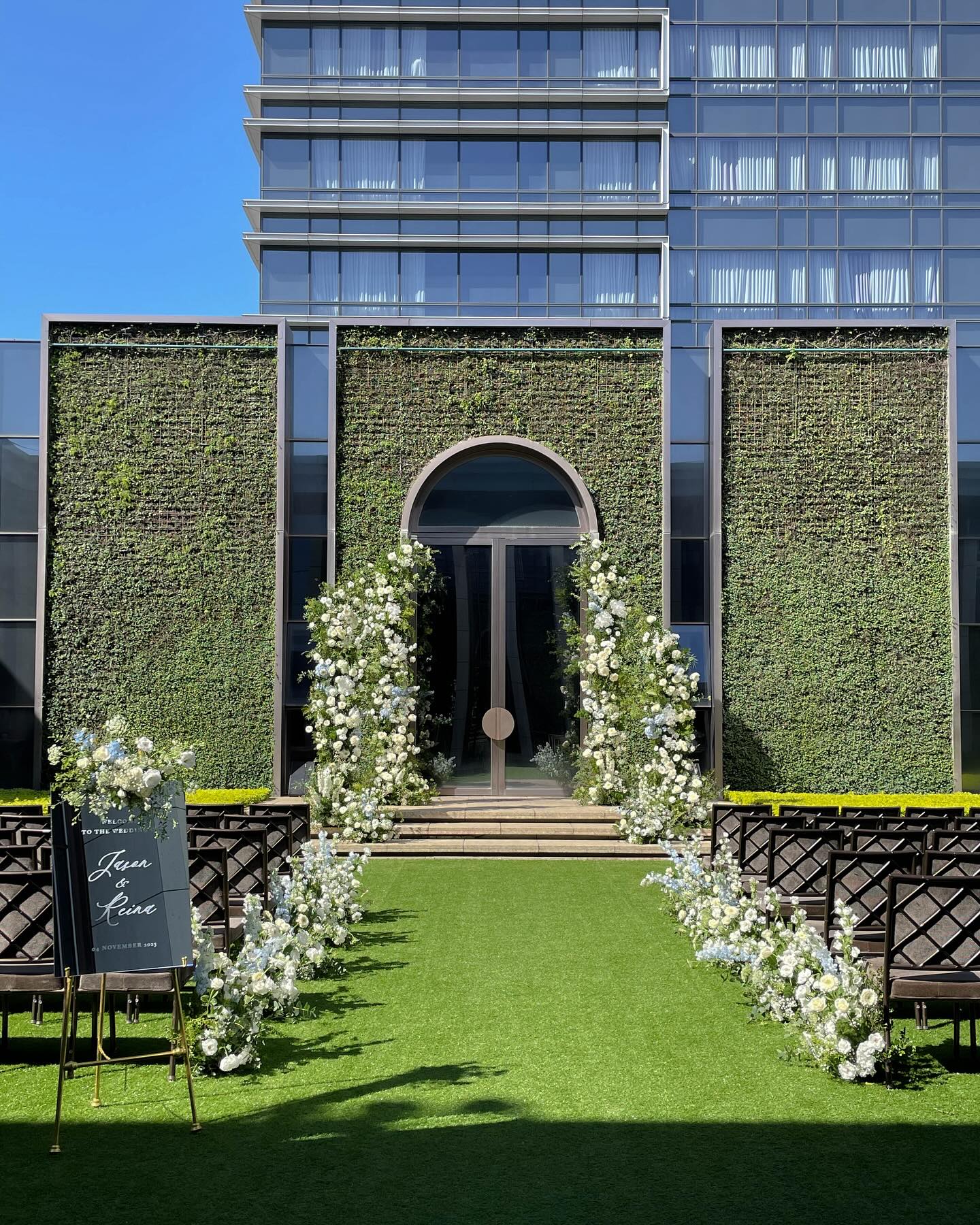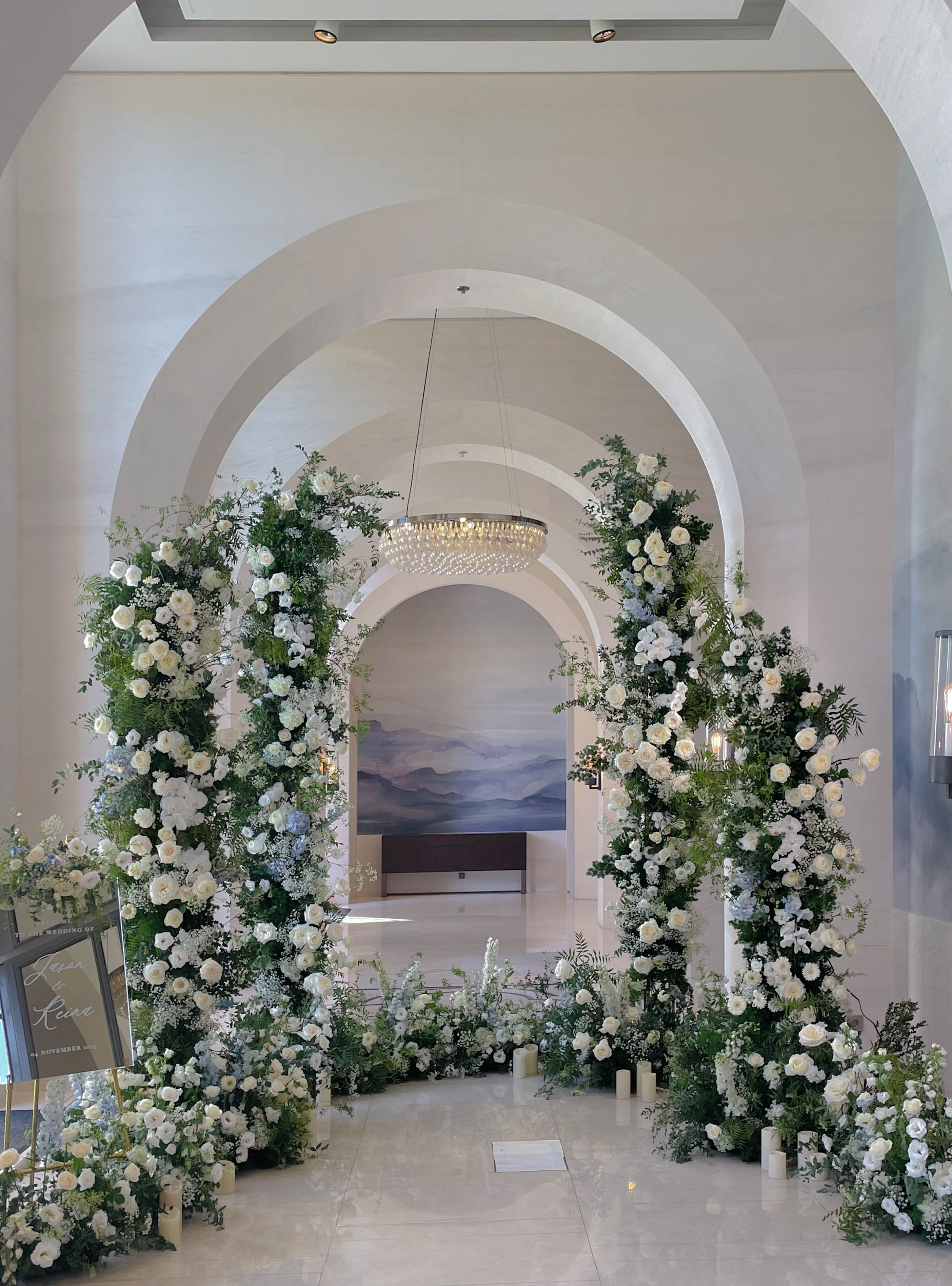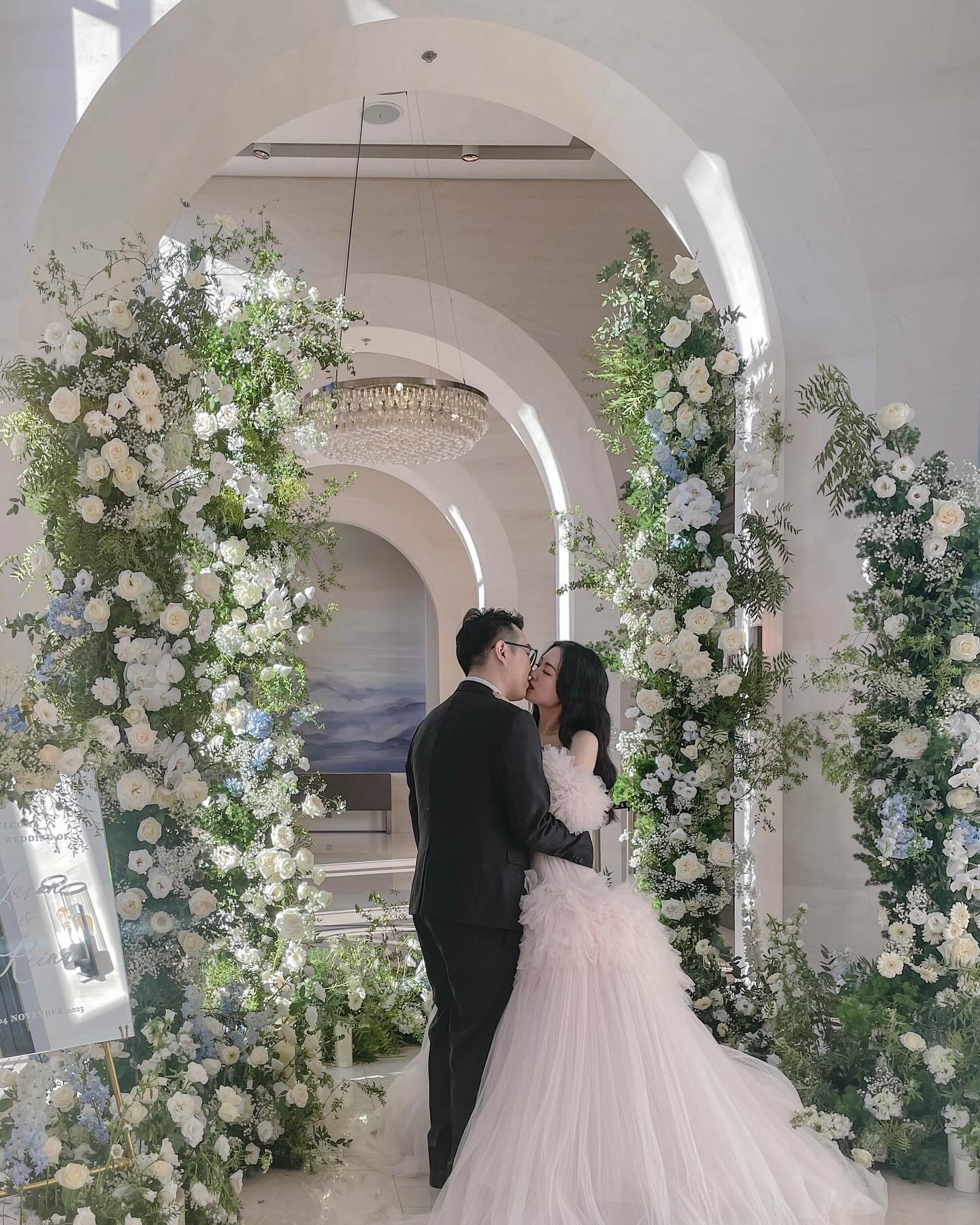 花藝色是經典的白色搭配水藍,融合萬豪場地的挑高拱形,加高的花柱拍照效果很棒🤍🤍